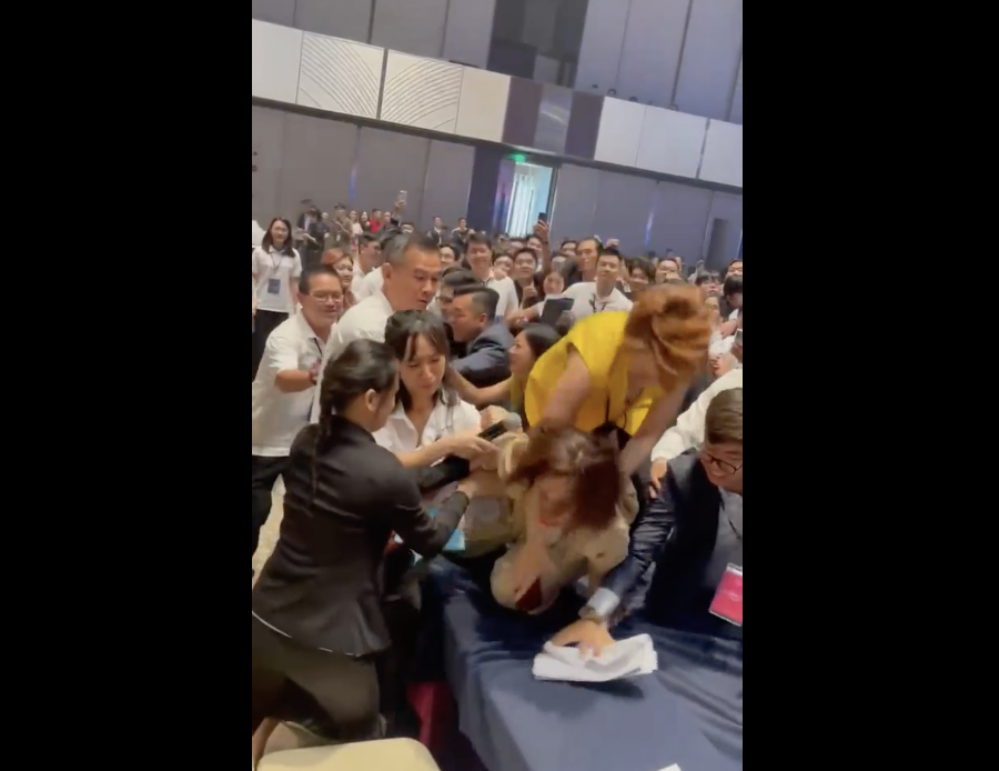 Đỉnh điểm là hình ảnh người phụ nữ tóc ngắn đã nhảy lên bàn đè đầu nhau xuống để tranh giành tờ giấy.